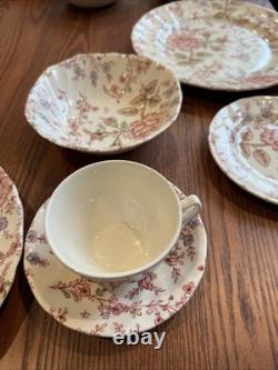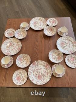 Brand New Johnson Brothers Rose Chintz 20-piece set. Crafted with care from high-quality ceramic, this set features a delightful Sweet Violet pattern that adds a touch of elegance to any table setting. Each piece boasts a charming pink hue complemented by intricate floral designs, ensuring that your meals are presented with a flourish. Designed with your convenience in mind, this set is both microwave and dishwasher safe, allowing for easy reheating and cleaning. The round shape of the plates aligns with modern dining trends, whether for everyday use or special occasions, this set brings a blend of style and practicality to your home.
